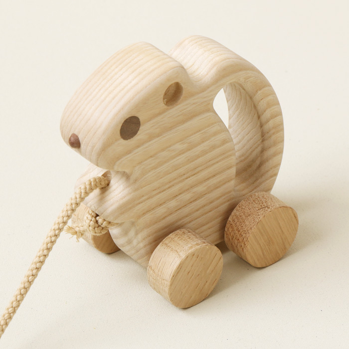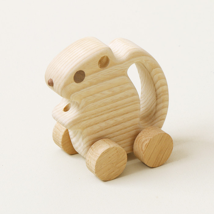 北海道の先住民であるアイヌの人たちが、子供の守り神と呼んでいた「エゾモモンガ」をキャラクターにした引き車のおもちゃです。この製品は白木(無塗装)仕様となっていますので、赤ちゃんがなめたりしても害はありません。