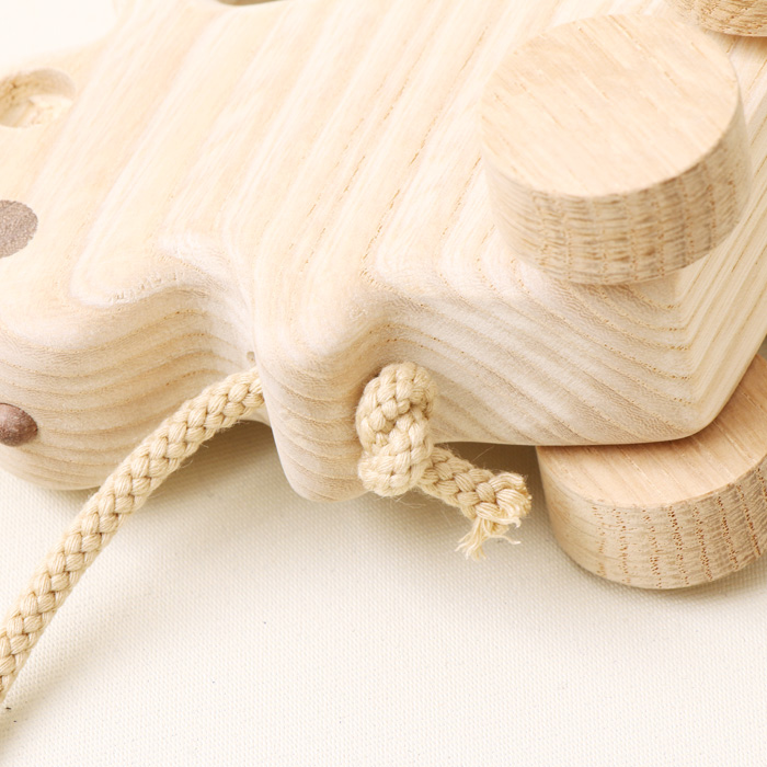 本体についているヒモは取り外し可能となっておりますので、お子様がまだ小さいうちはヒモは付けずに、本体を振って車輪部のカラカラという音を楽しんで遊ぶことができます。やがて立って歩けるようになったらヒモを付け、引き車として遊ぶことができます。